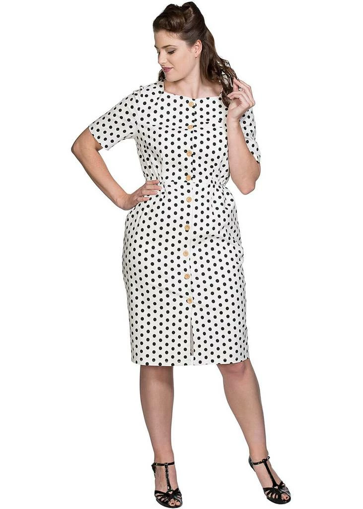 Her woorden functional buttons are a smashing detail on the white cotton mix with a slight stretch and black polka dots! Because she closes with the buttons it creates a short slit on the front, unless you unbutton one more 😉