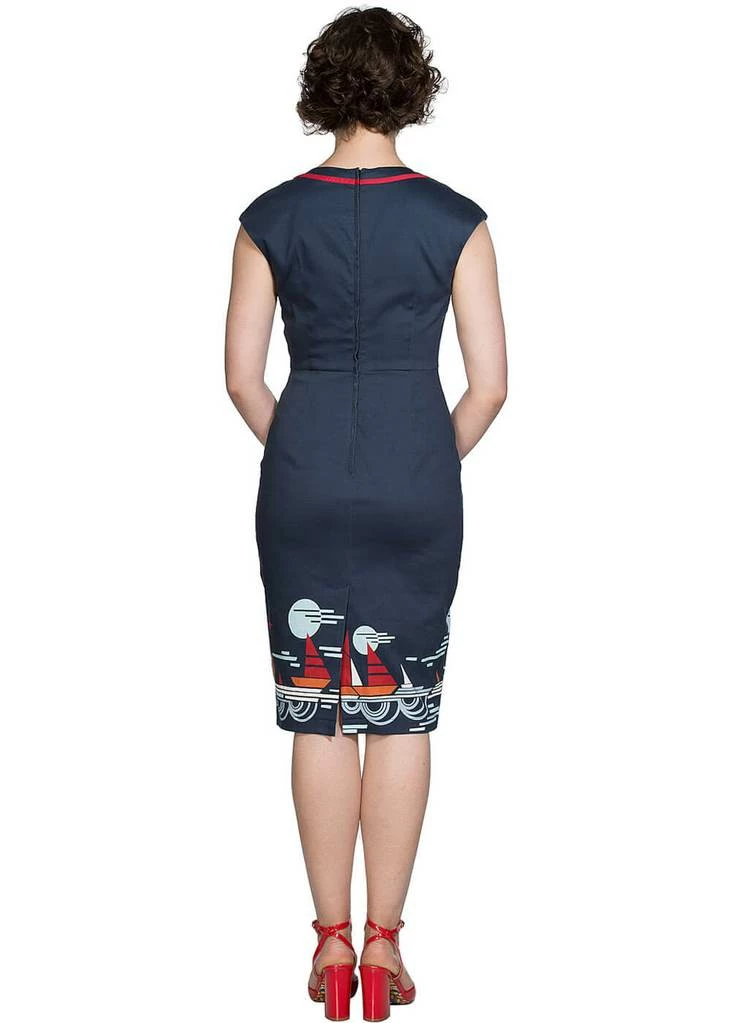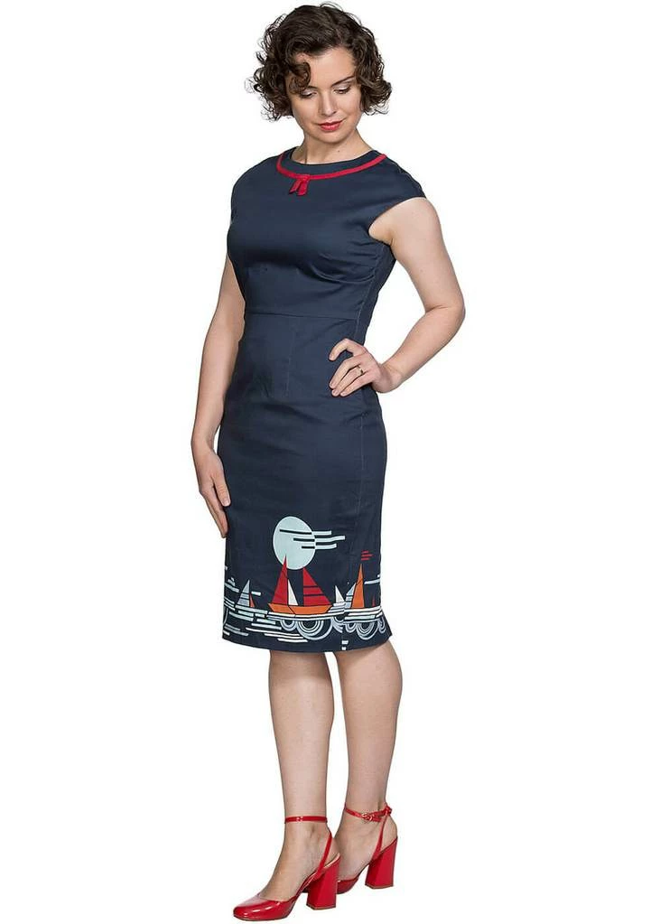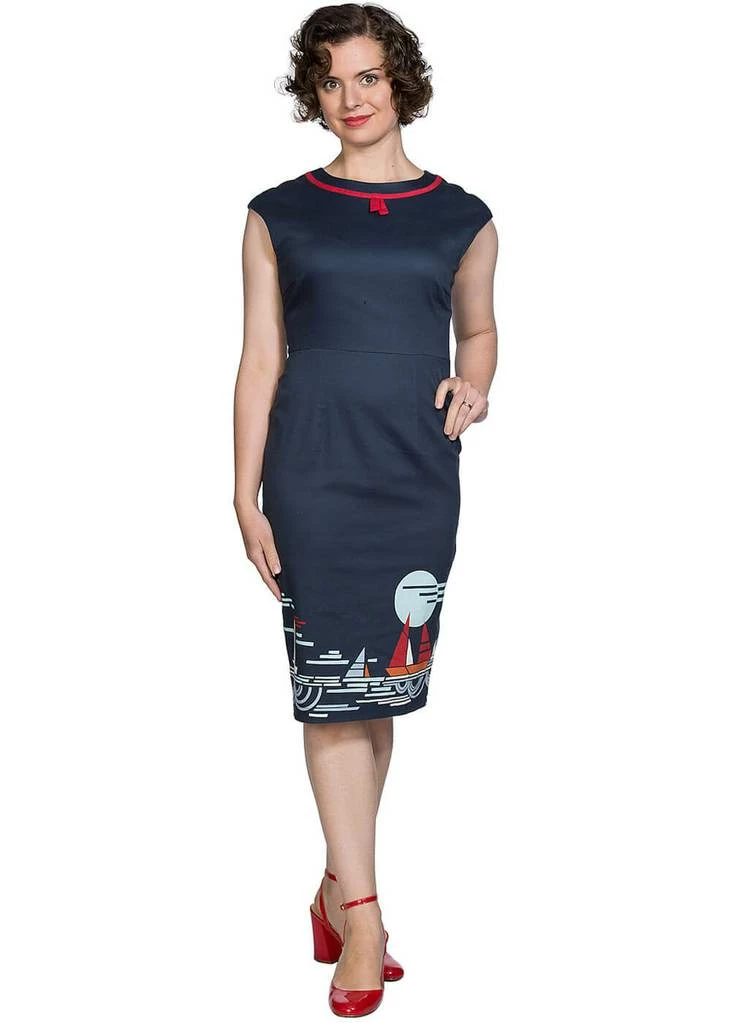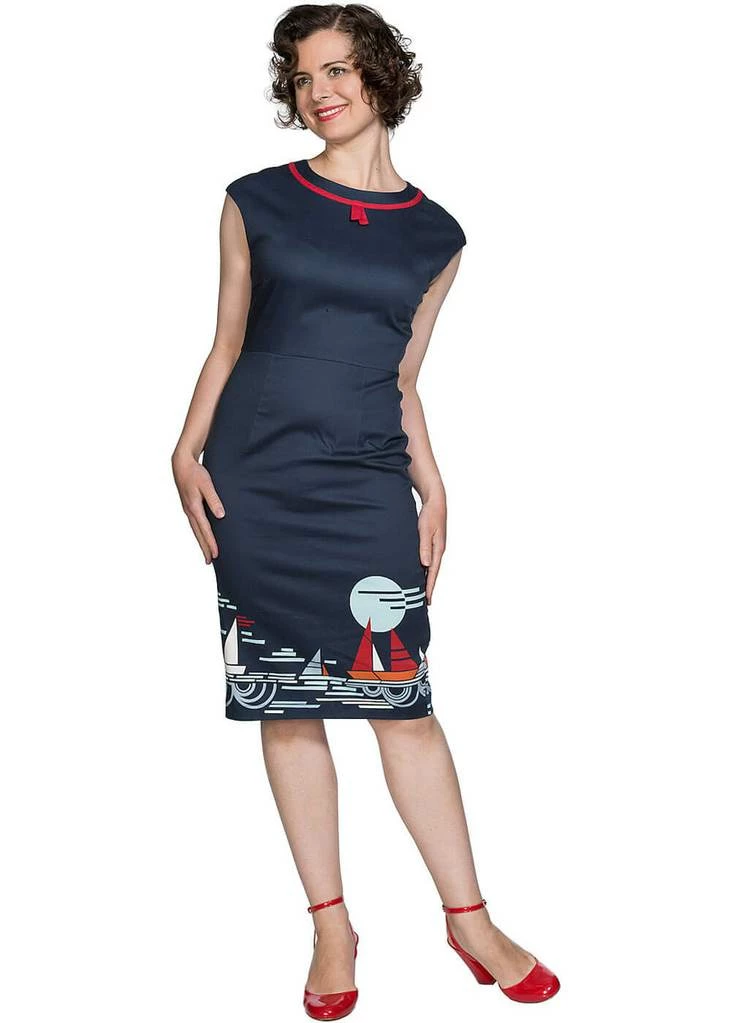 Cover yourself in boats and waves this summer, which are extra striking because of the red details. The bodice is beautifully formfitting because of the princes seams and the waist is accentuated by the seam. She continues into a playful pencil skirt with figure seams, which with a height of 1,70 reach down to the knee. She’s made of a beautiful quality cotton-mix with a slight stretch, for that Vavavoom feeling 😉 She closes with a zipper on the back where she also has a slit.