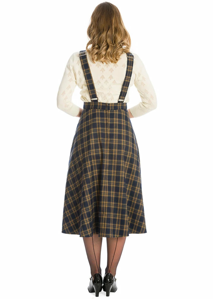 The shoulder straps are adjustable and she is made of a lovely smooth fabric with slight stretch. From the waistband down, she flares into a vivid skirt with pockets, which you can beautifully wear with one of our petticoats. For a height of 1.70m, she ends below the knees and she closes with a zipper and hook in the back.