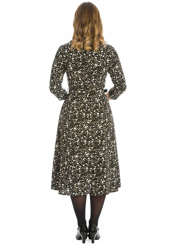 The bodice is adorned with a collar and smooth buttons until the waist, while she closes with a zipper in the back. The flat pleats at the shoulders as well as above and underneath the waist make for a perfect 40’s look. The waist is accentuated by the removable belt, from where she flares into an elegant A-line skirt with pockets. She closes with a zipper in the back and falls below the knees for a height of 1,70 m.