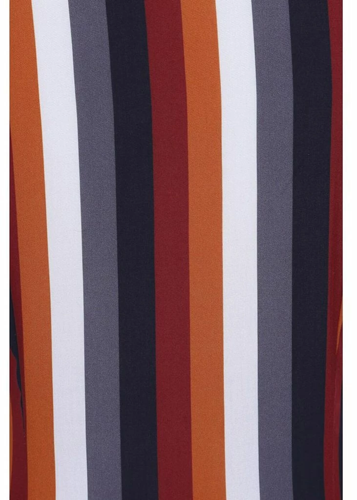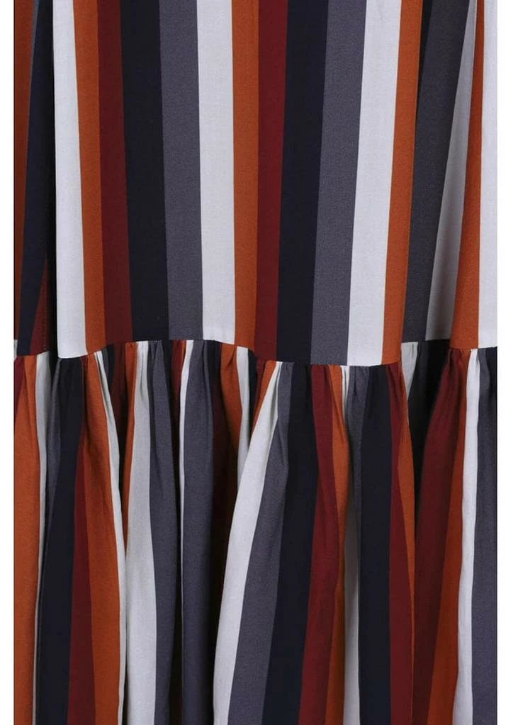 Her striped lines in orange, rust, navy and broken white are the perfect fall colours, while her airy 100% rayon with no stretch and flowy model makes you think of summer.