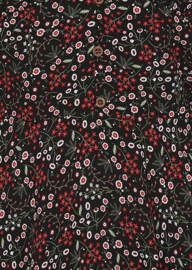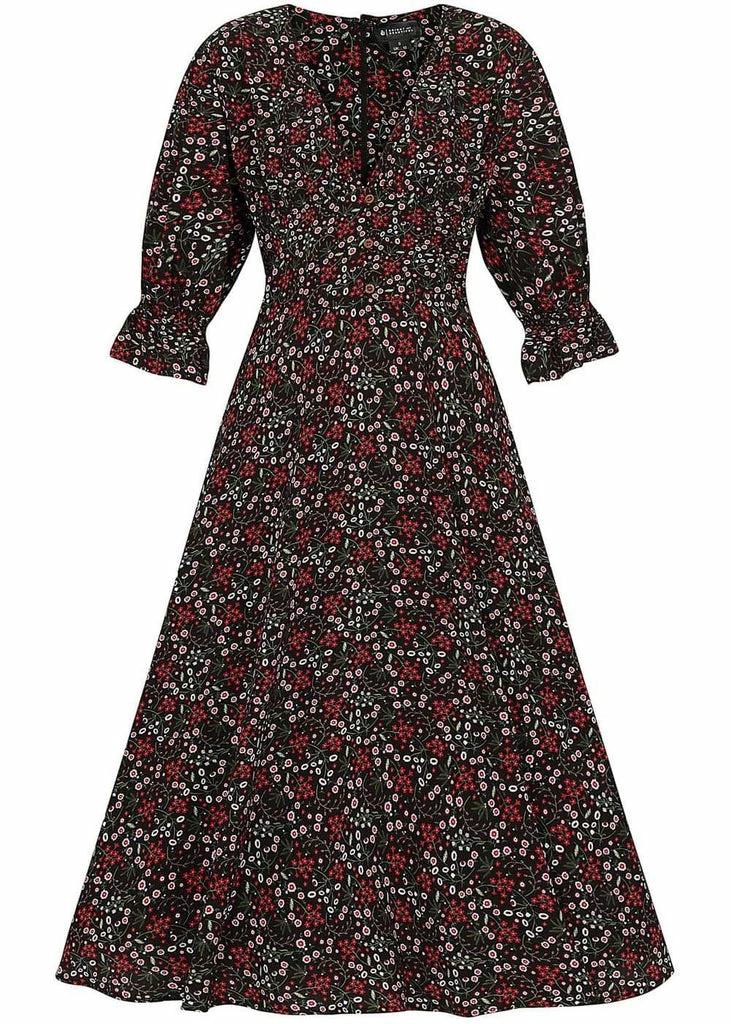 In the woods or snuggly on the couch, Hayden is the perfect boho-chic dress with her wooden decartive buttons and the v-neck! Her half-long sleeves are playfully puffy because of the smocked ends. Her 100% rayon without stretch is so light to wear, the tender flower pattern seems to fly off it! From the seam by the waist, she flares until around halfway down the calves for a height of 1,70 m and she closes with a zipper in the back.