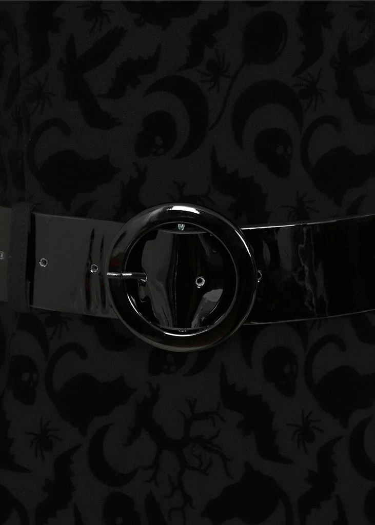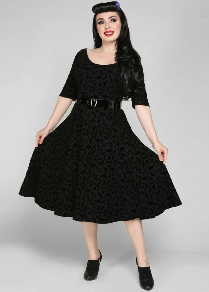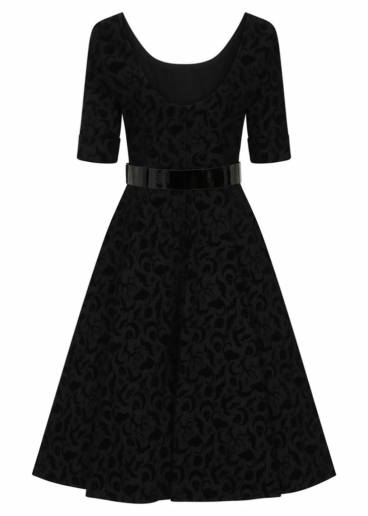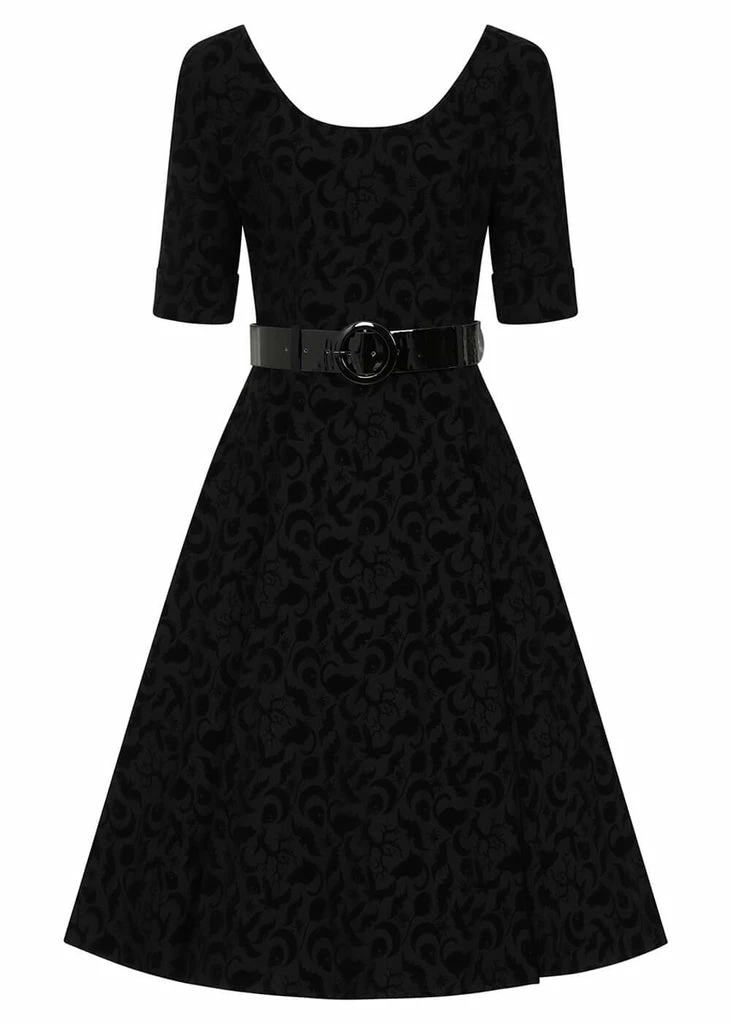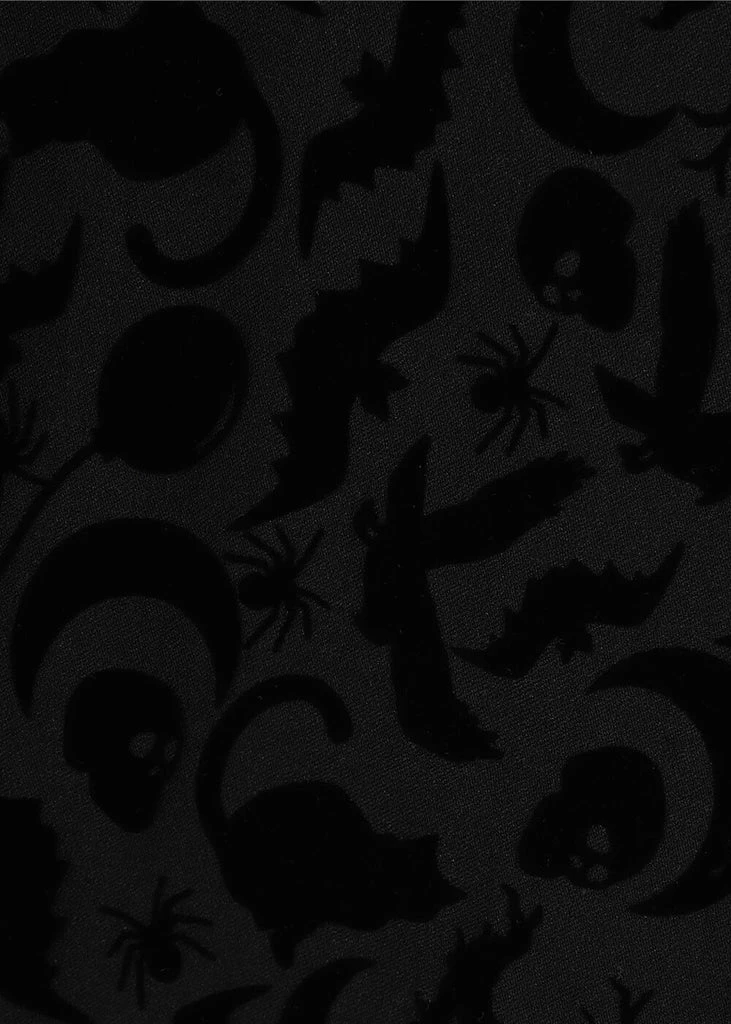 This beauty consists of a lovely fabric with a slight stretch, covered in Halloween symbols. The wasit is accentuated by the detachable belt, down from which she continues into a full skirt. Which is perfect for combining with one of our petticoats to make those symbols dance. With a height of 1,70 she reaches down below the knee and closes with a zipper on the back.