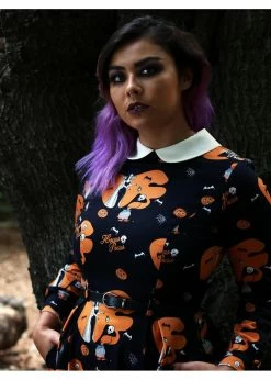 How misleadingly sweet that collar looks with that extraordinary print! The princess seams, together with that gorgeous quality cotton-mix with a slight stretch ensure a beautiful fit. The waist is accentuated with the loose belt, down from which she flares out into a full skirt. To let those ladies fly you can naturally wear her with one of our petticoats! She closes with a zipper on the back and with a height of 1,70 she reaches down to the knee.