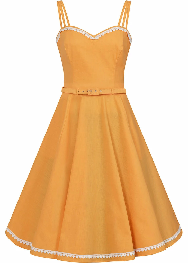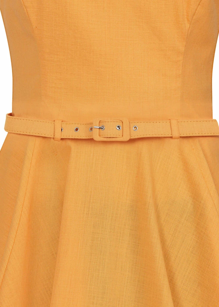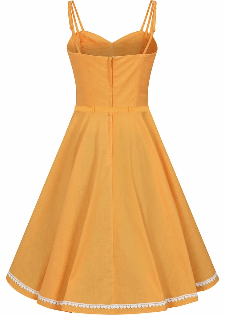 The waist is accentuated with the removable belt, from there she flares into a lovely full skirt with pockets. Perfect to wear with one of our petticoats for the extra happy twist! She closes with a zipper in the back and for a heigth of 1.70m, she ends below the knees.