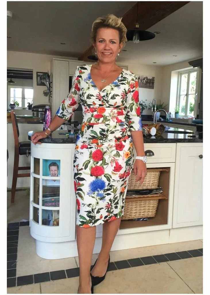 The pleats over the front are masking a little belly and make for a flattering fit, as do the figure seams. She closes with a zipper in the back, where she also has a split to make walking more convenient. Diva Catwalk is made in the UK.