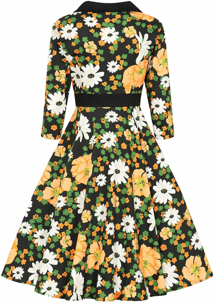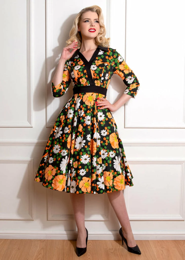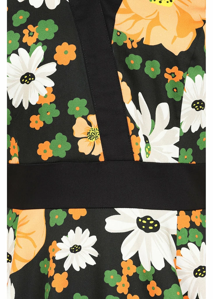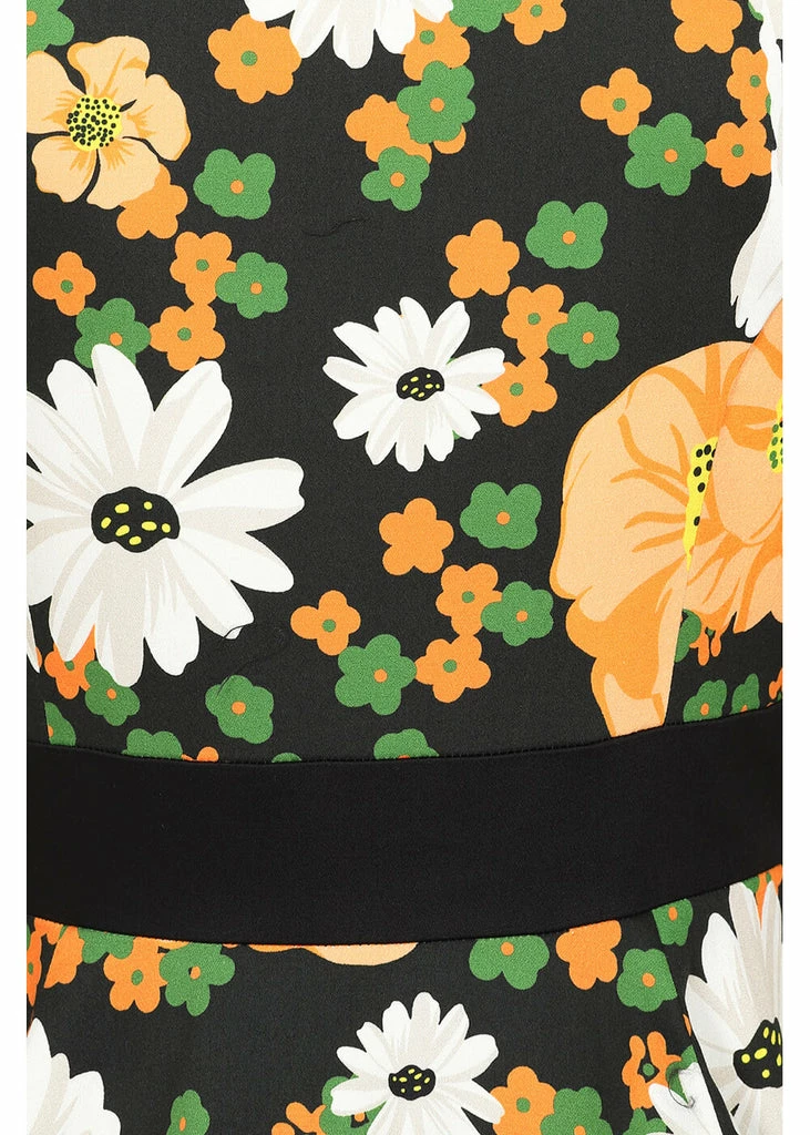 This beauty is pure vintage fun with her cotton-mix with fine stretch and playful flowers. The v-neck and the waist are accentuated by the black detail, that runs diagonally across the bodice and ensures an irresistible look.