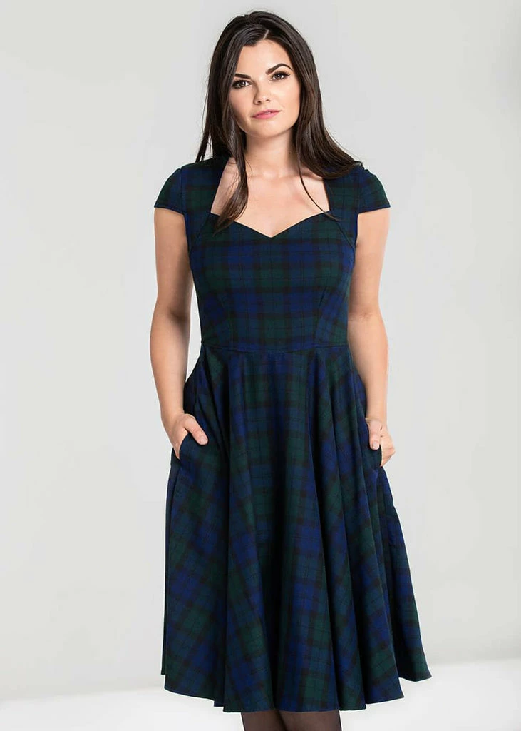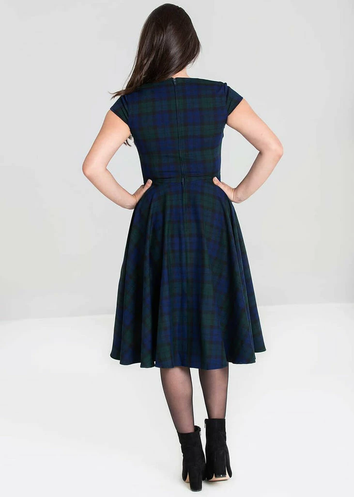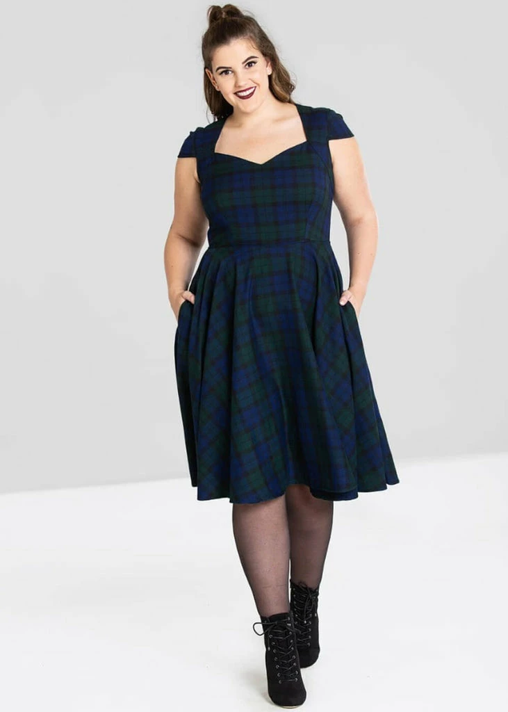 The stylish tartan fabric has a slight stretch and with her capsleeve so flirty. The seems on the bodice and the high back give it a lovely fit.