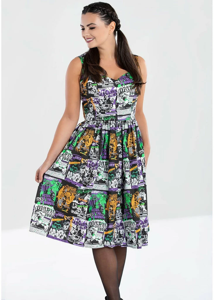 Small folds flare from the waist seam into a full skirt with pockets, that you can wonderfully wear with one of our petticoats to make the movies come to life. She’s made of a high quality cotton-mix with slight stretch, closes with a zipper in the back, and for a height of 1,70 m she ends around or just below the knees.