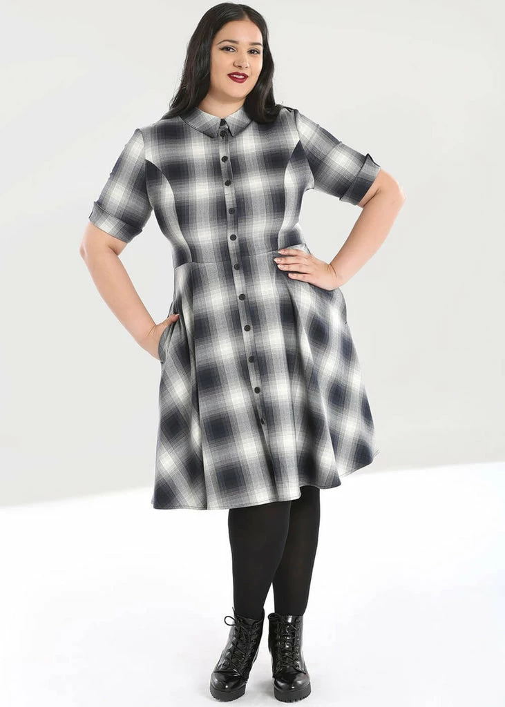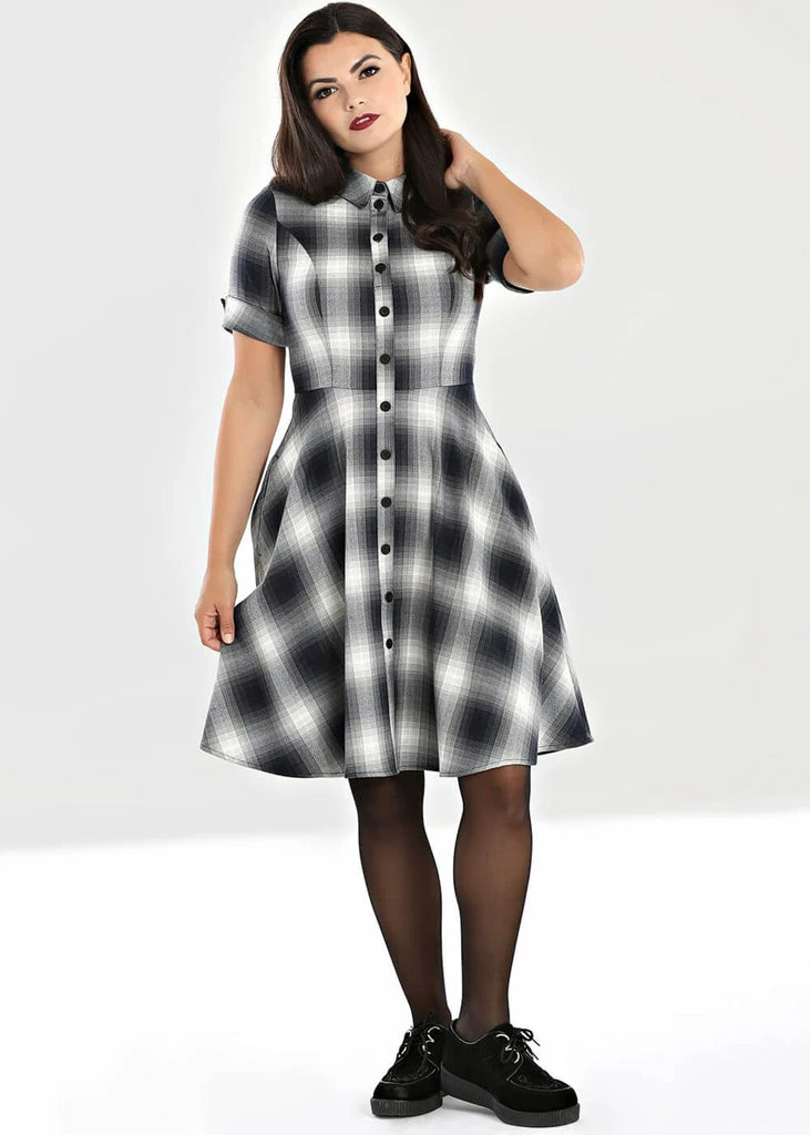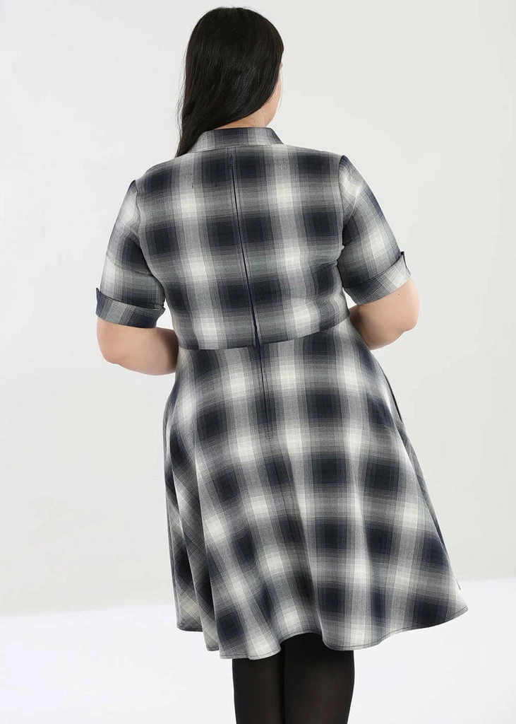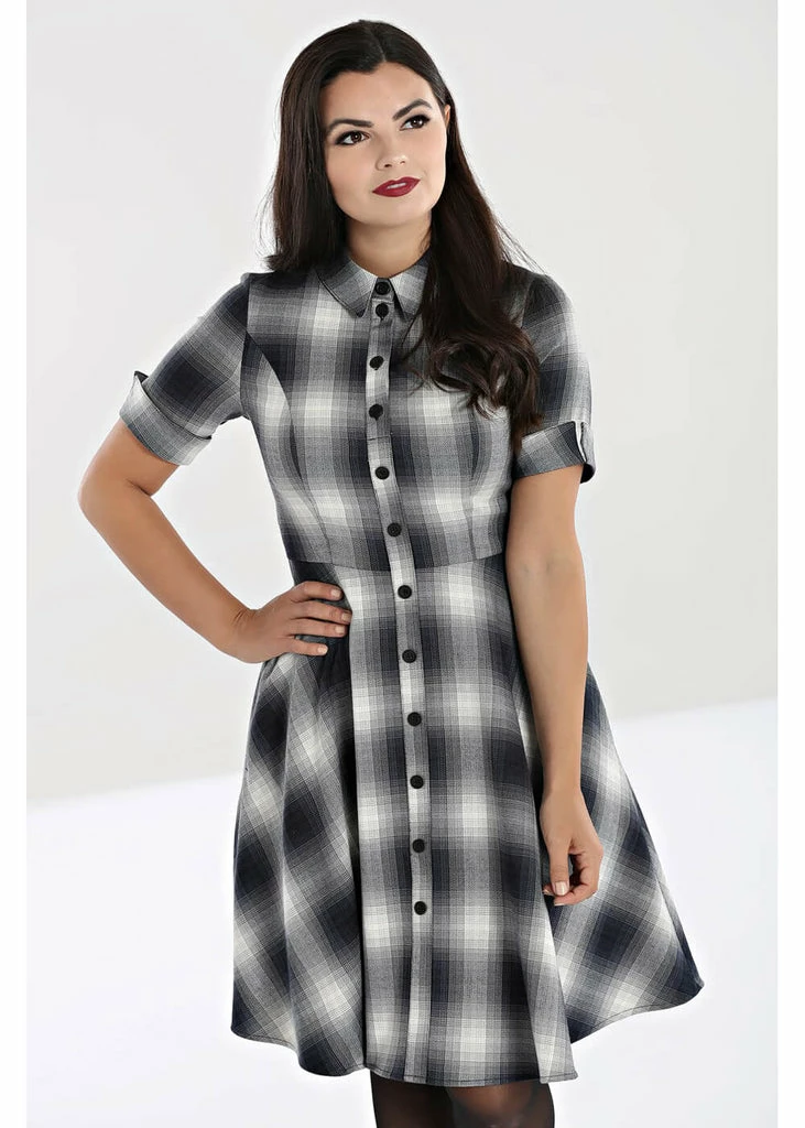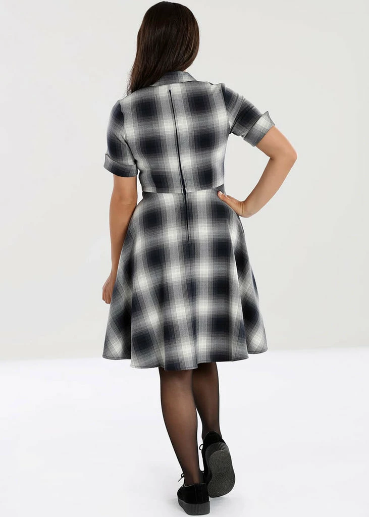 The special grey and black tartan makes for a look somewhere between innocent and punk, all our facets are there! She has a row of buttons running all the way along the front, but don’t worry: She closes with a zipper in the back. Her smooth soft fabric has slight stretch so she’s lovely to wear and nicely close-fitting. The roll-up at the short sleeves completes the look.