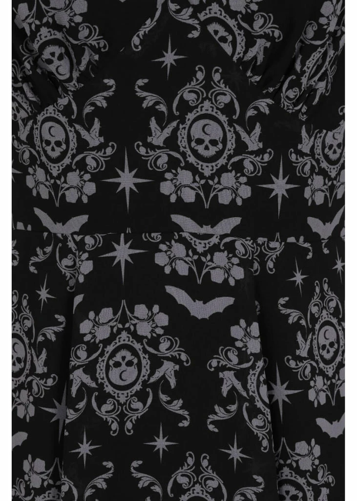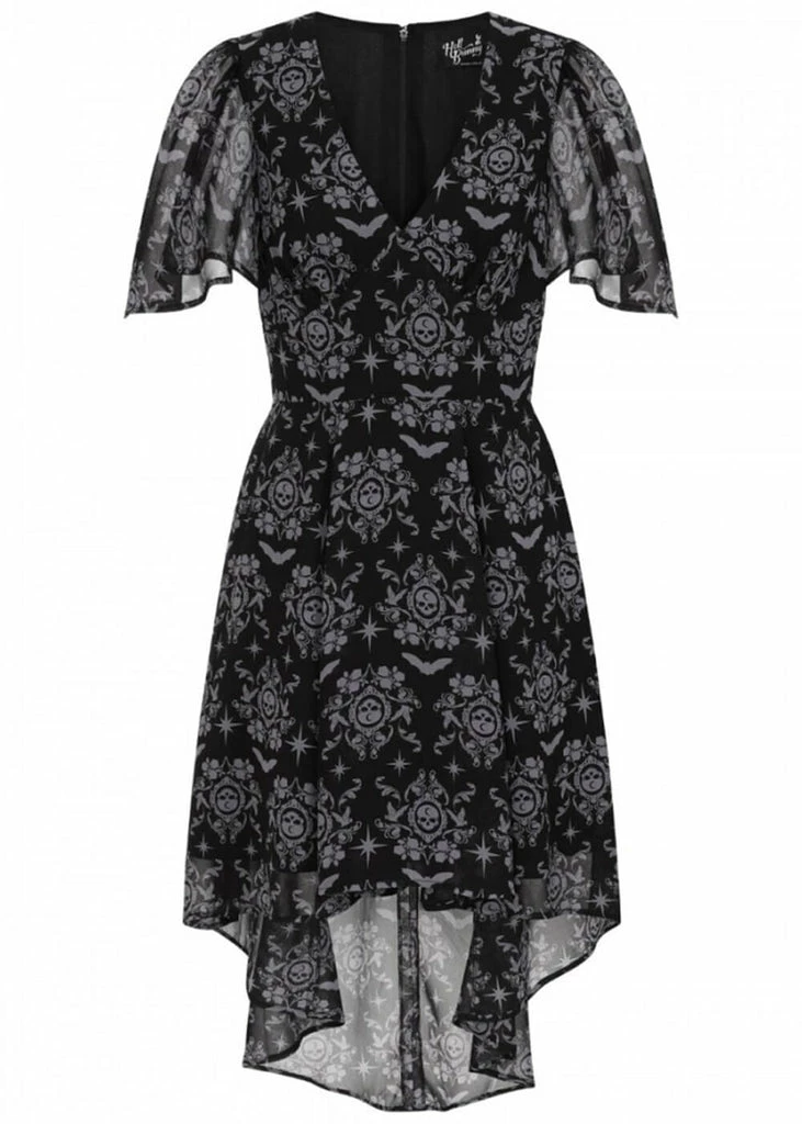 They’re looking at you from the black, semi-transparent chiffon, the grey skulls on this stunning dress… The seams that run from the v-neck underneath the chest and the vivid short sleeves make for a 70’s look that will surely get attention.