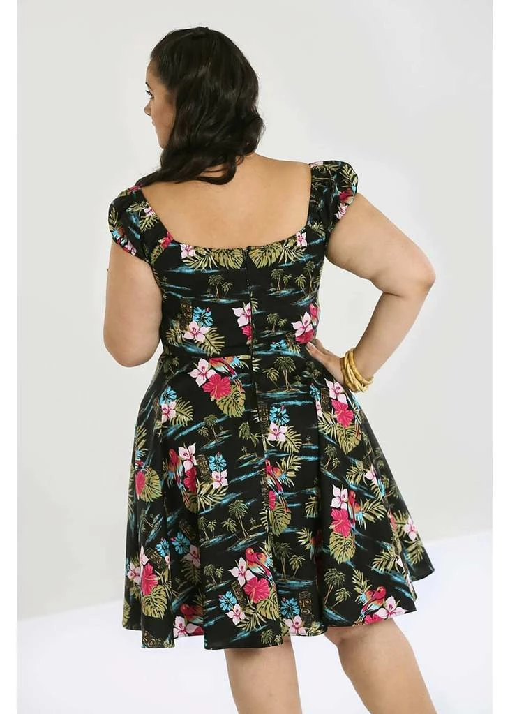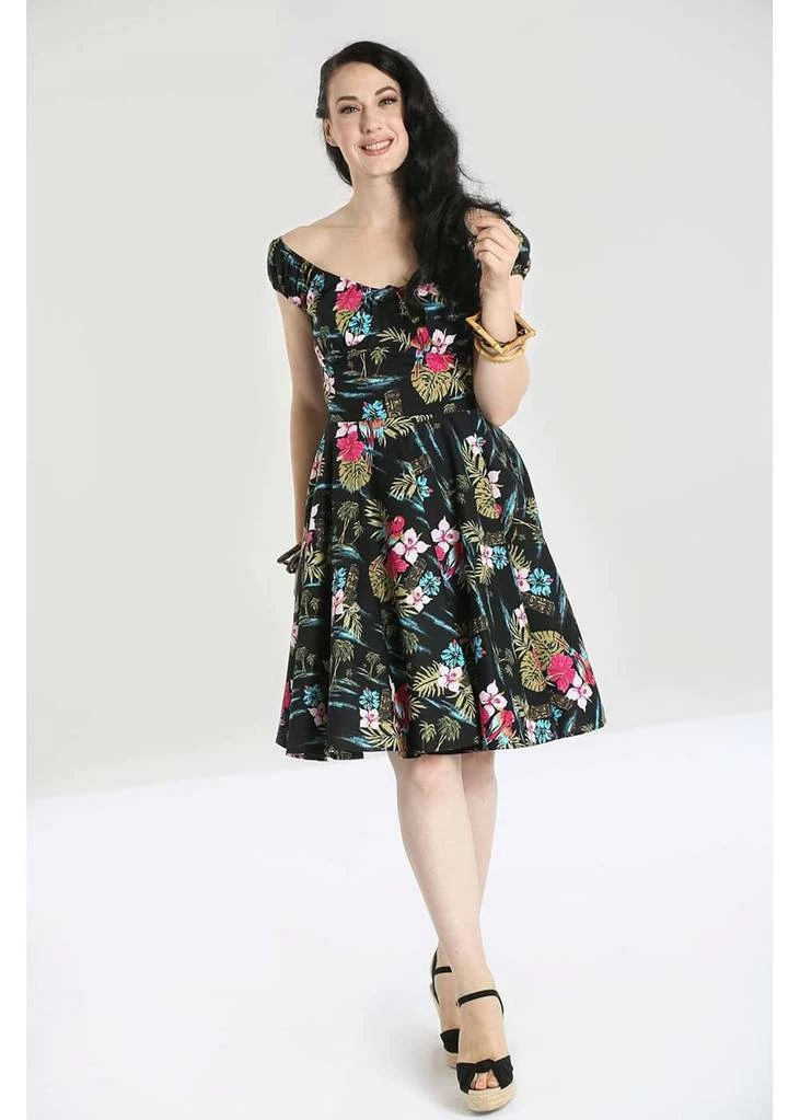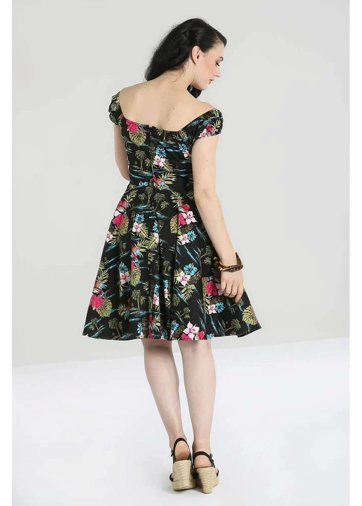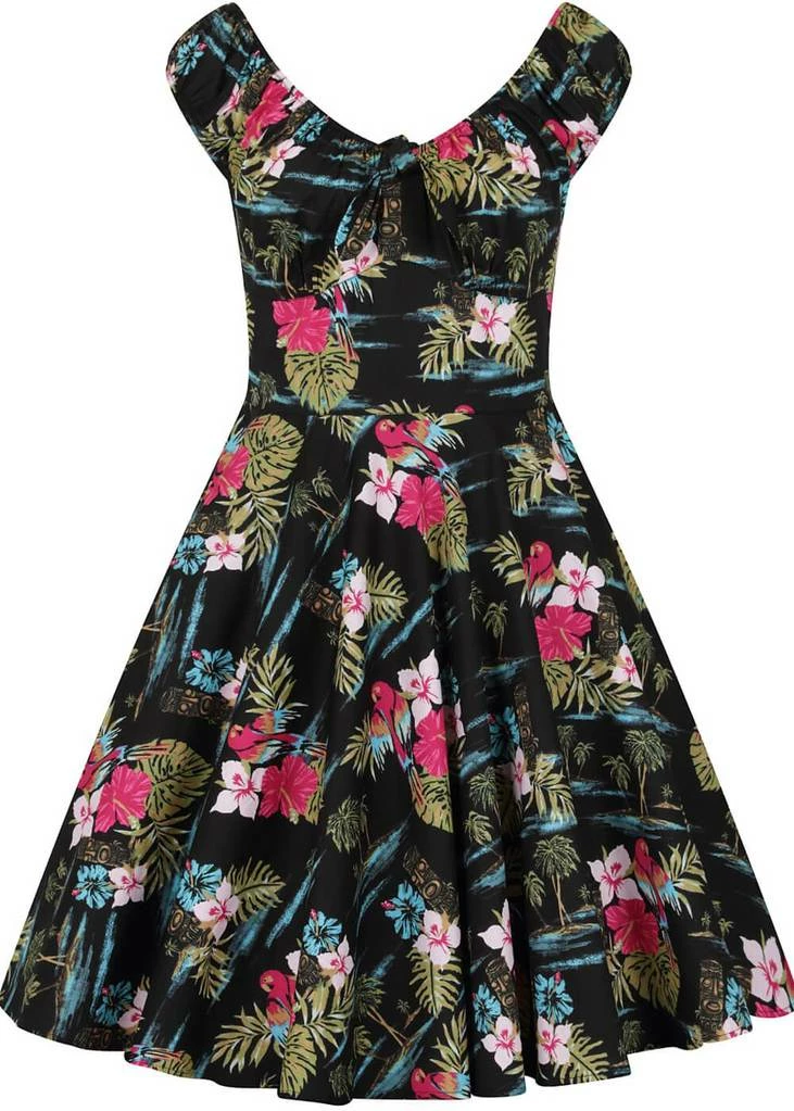 Oo La La, such a seductive piece of shoulder you show by wearing the elastic sleeves off-shoulder! She is made of a lovely cotton-mix with a slight stretch making her feel lovely to wear. From just above the waist she flares out into a full skirt, which you can wear even more festive with one of our petticoats. She closes with a zipper on the back, has a lined bodice and with a height of 1,70 she reaches just on or over the knee.