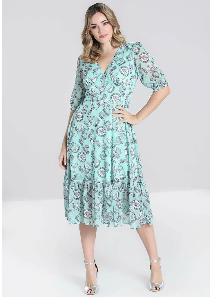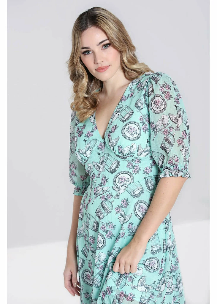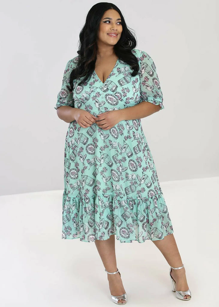 There are seams emerging from the v-neck, which run underneath or across the chest, for the classic vintage look. The halflong sleeves are semi-transparent and slightly puffy thanks to the gatherings at the shoulders and the fine elastic. The waist is adorned with decorative buttons, before she flares into a full skirt with a ruffled edge, that ends below the knees for a height of 1,70m.