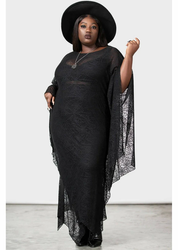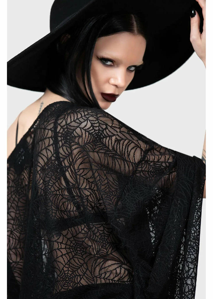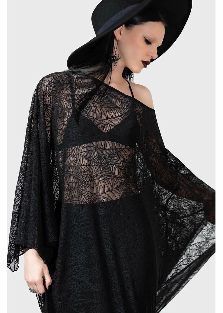 This is every Ghoul girl’s dream dress, with her descending shoulder and batwing-model? Her incredible spiderweb lace has fine stretch and is semi-transparent, so you can wear her with a dress, a skirt or trousers underneath.