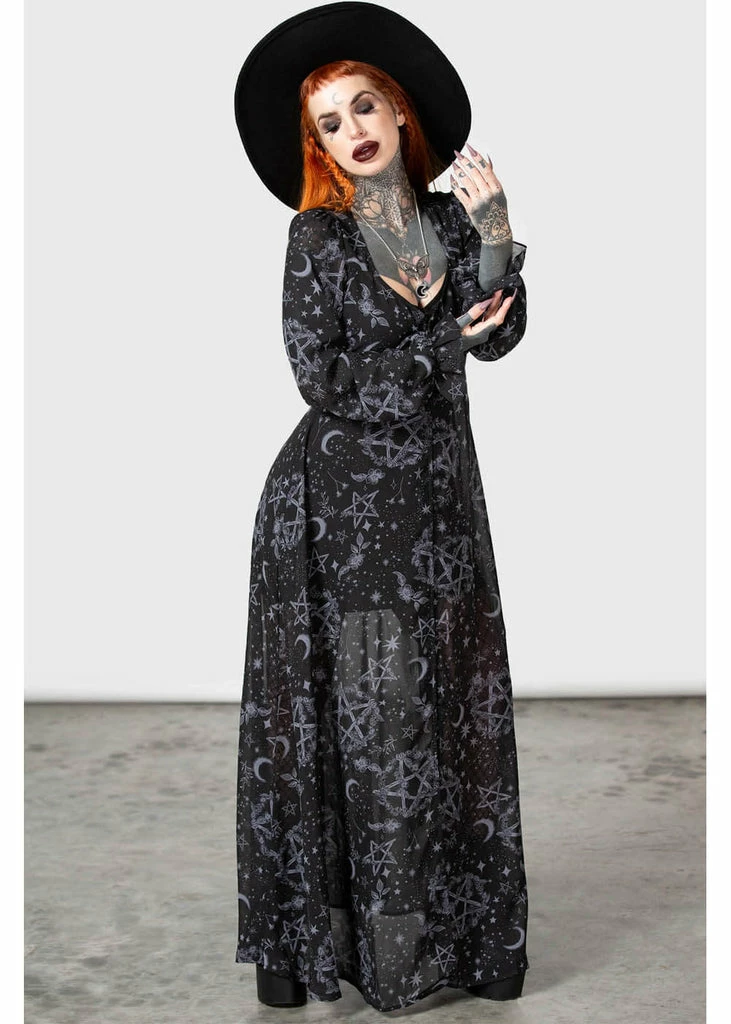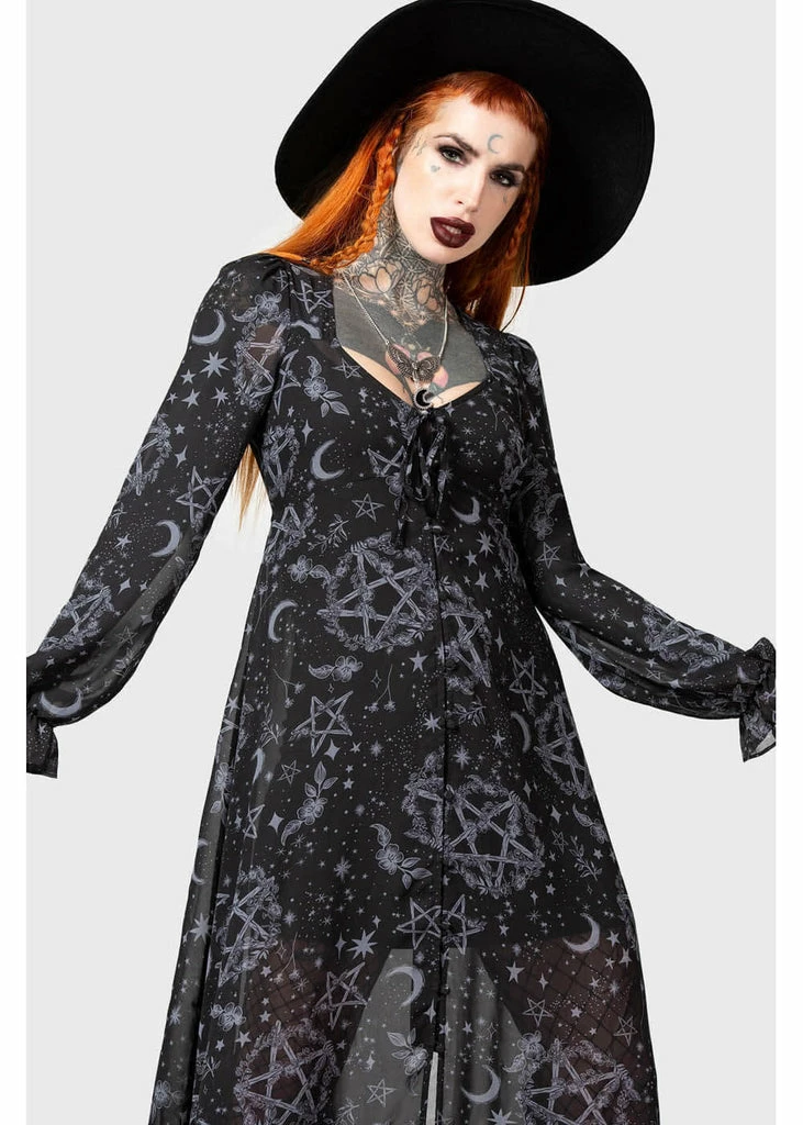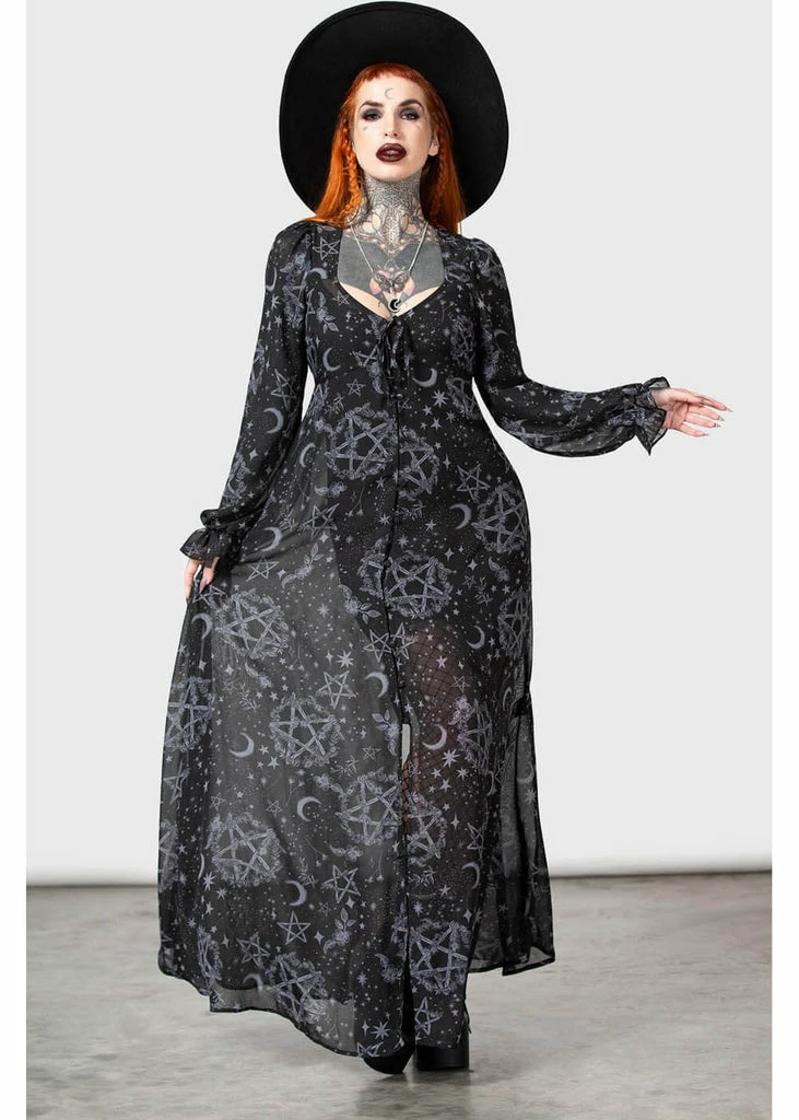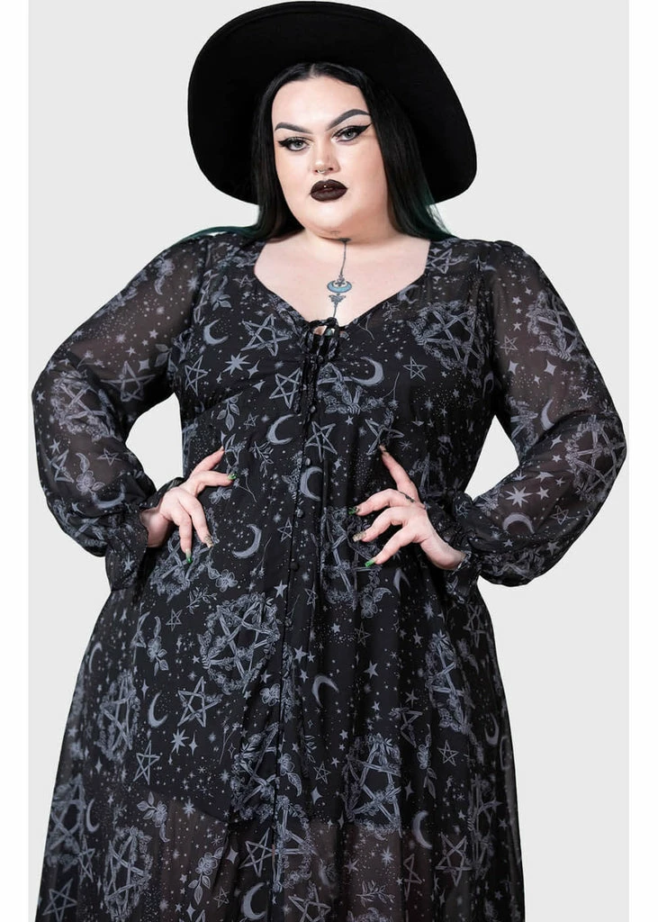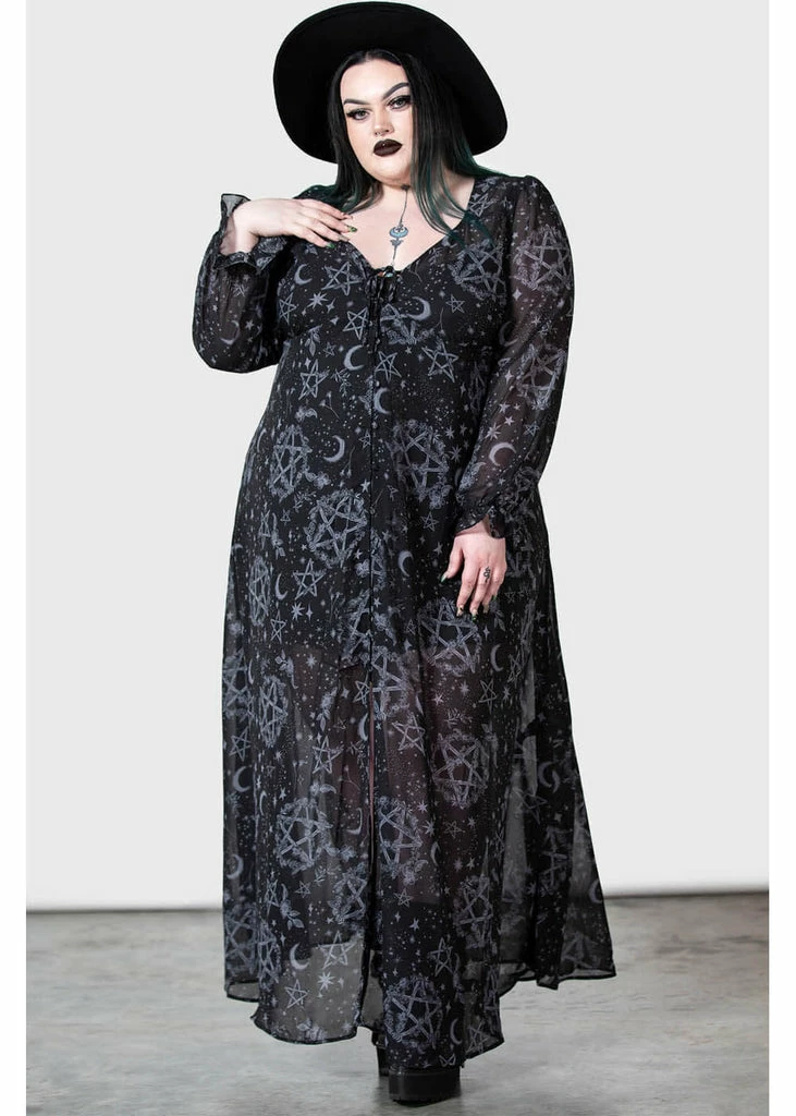 How breathtaking Lauma is: her semi-transparent chiffon without stretch feels so nice, it’s out of this world, while the occult symbols make for a special witchy look. Thank sto the short underdress, you don’t show too much while keeping the elegance.