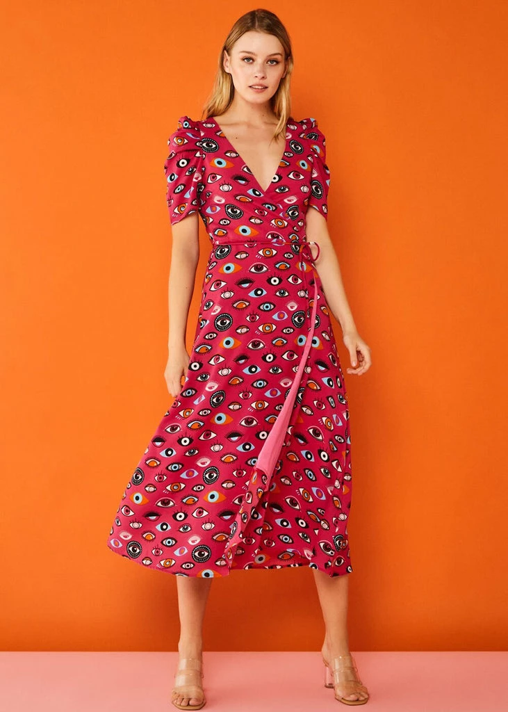 With or without lashes, in the most exciting colours, they’re all looking at you, even from the short puffy sleeves! This midi-dress is a real wrap-model, which you tie in the waist with a strap of the same design. From there, she flares into an elegant skirt that ends about halfway down the calves for a height of 1,70 m. She is made of a smooth fabric without stretch, that feels fantastic.