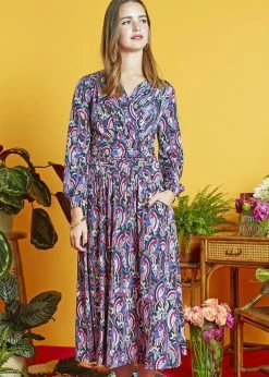 The bodice has a wrap and an elegant drape appearance because of the pleats on the shoulders. The waist is also pleated, down from which she flares out into a playful long skirt which with a height of 1,70 reaches halfway down the calf. She even has pockets!
