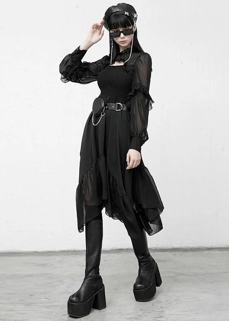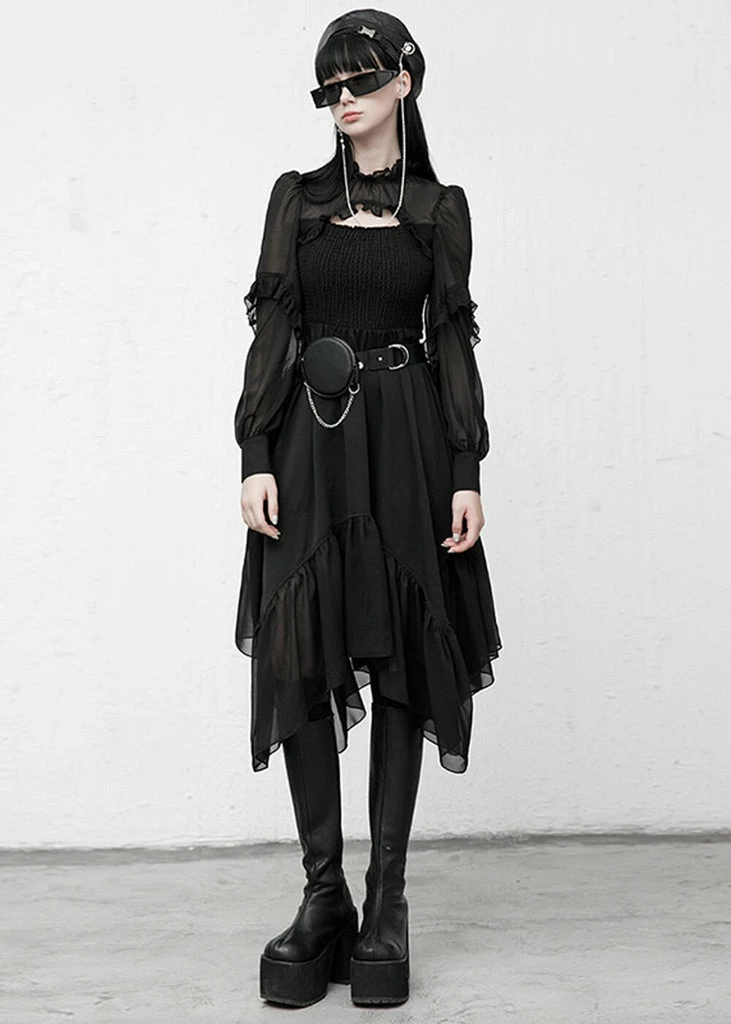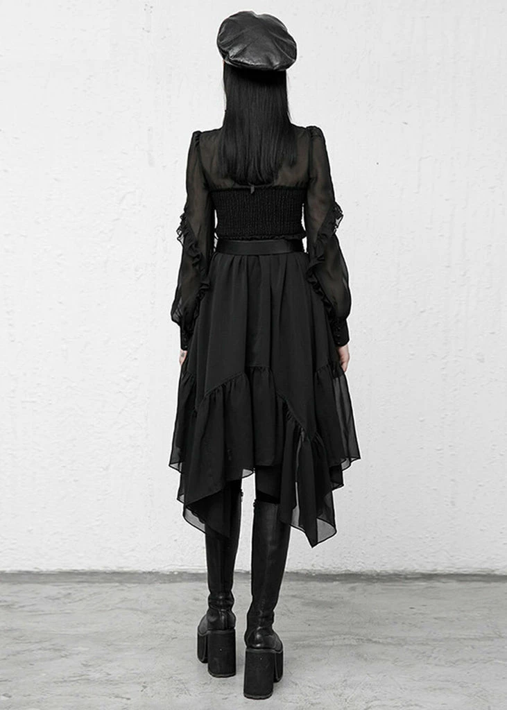 She does everything to make an impression: her semi-transparent chiffon returns at the puffy sleeves, and runs further over the bodice, which has a playful peekaboo.