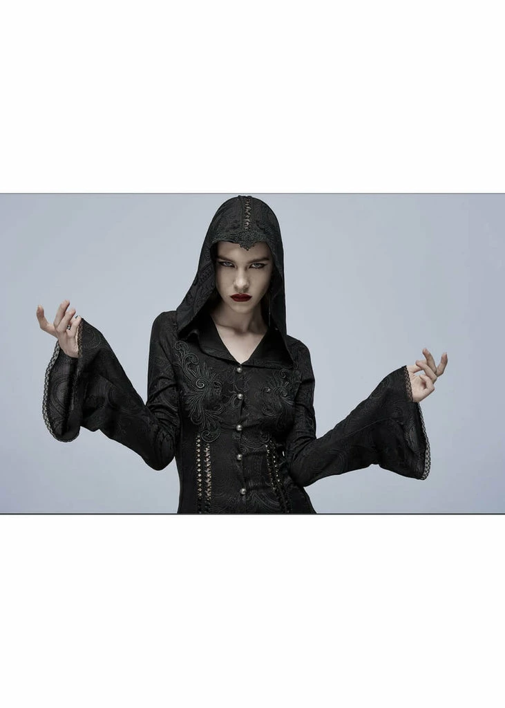 This beauty is made of a smooth fabric with a breathtaking pattern of plants with thorns and has stretch, which makes her fall gorgoeously heavy around your body. She closes withbuttons in the front underneath the low v-neck and falls open from there, so she’s perfect to be worn over another dress or leggings. The back is decorated with a delicate lacing and the long, flaring sleeves are adorned with a lace edge.
