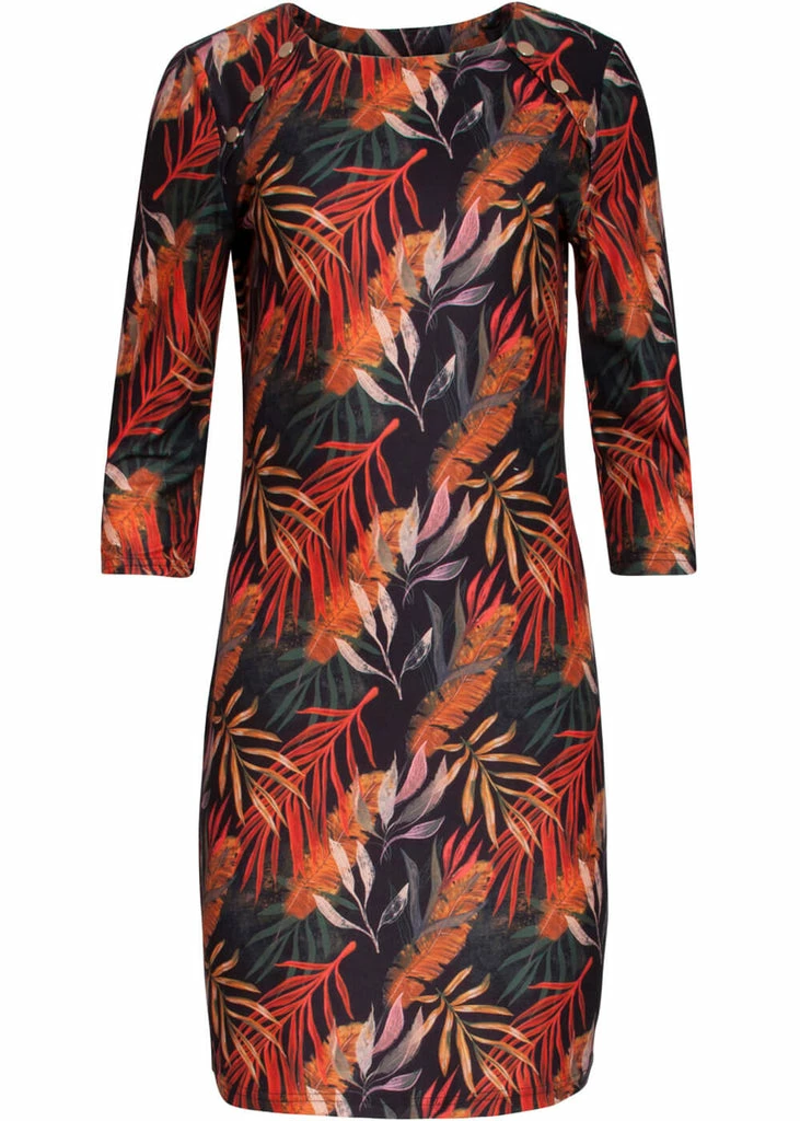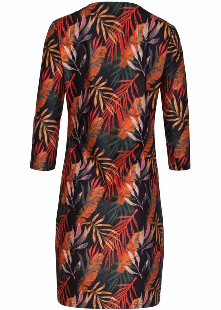 Autumn Feathers combines warm shades like rust and green and as bonus she’s heaven to wear with her soft and smooth fabric with fine stretch. Her 3/4-sleeves make her the perfect choice for colder days, while the coppercoloured faux-buttons at the shoulders have a subtle gloss. She continues below the hips as a VaVaVoom pencil skirt, that ends around the knees for a height of 170 cm..