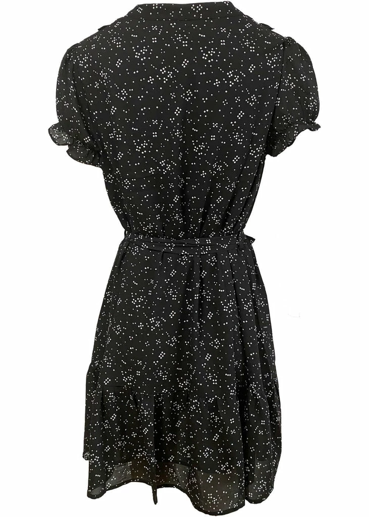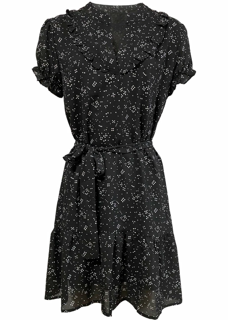 Her thicker chiffon without stretch is oh so black and so sweet with the ruffled edge at the v-neck, that perfectly matches the ruffled seam in the back. This cutie is inspired by a 60’s babydoll model, that elegantly flares from the chest and has short pufy sleeves thanks to the fine elastics. With the detachable sash and the belt loops, you can also accentuate the waist, several looks in 1 dress!